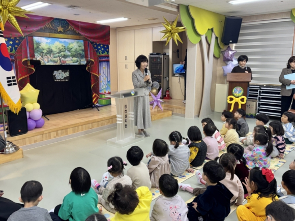 입학식은 새로 부임한 조미연 원장님의 환영 인사와 유치원 모든 교직원의 축하와 격려 속에 진행되었다. 조미연 원장은 “유치원에서 친구들과 사이좋게 지내고 급식도 골고루 먹으며 건강하게 생활하자”고 따뜻한 당부의 말을 전하며 유아들이 서로 존중하고 배려하는 마음을 배우는 행복한 유치원이 되기를 바란다고 전했다.