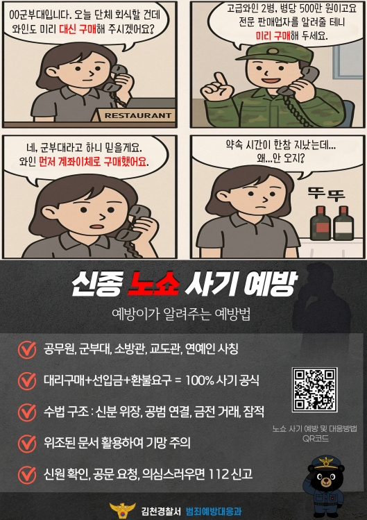 지난주 발생한 ‘노쇼 사기’의 주요 사례로는 1. 김천시청 000과 직원 사칭 물품 대리 구매 입금 요청 2. 김천 교도소 직원 사칭, 소화기 대리구매 요청 3. 00고등학교 행정실장 사칭, 산소공급기 대리구매 요청 등이 있으며
