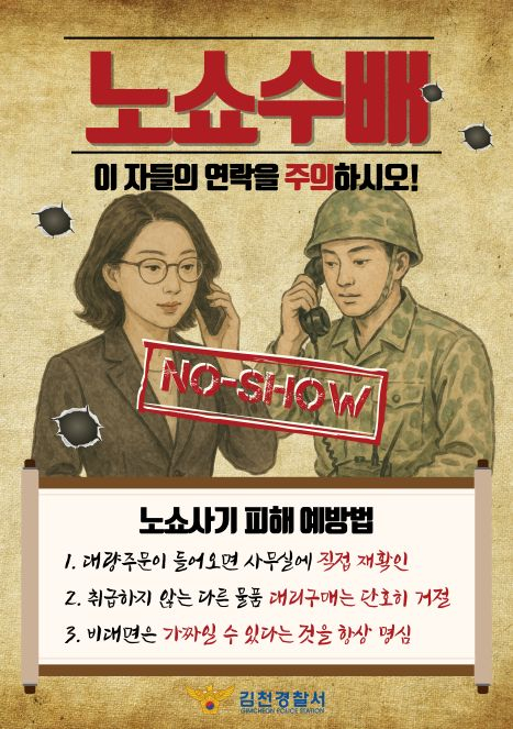 지난주 발생한 ‘노쇼 사기’의 주요 사례로는 1. 김천시청 000과 직원 사칭 물품 대리 구매 입금 요청 2. 김천 교도소 직원 사칭, 소화기 대리구매 요청 3. 00고등학교 행정실장 사칭, 산소공급기 대리구매 요청 등이 있으며 최근에는 김천 지역 의료기관 직원이라고 밝히고 용역계약 및 물품대리 구매를 사칭하며 입금 요청하는 사례가 빈발하고 있어 시민들이 의료기관에 확인 전화를 하는 등 노쇼 사기가 지속적으로 발생, 시민들의 각별한 주의를 당부했다.