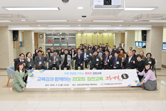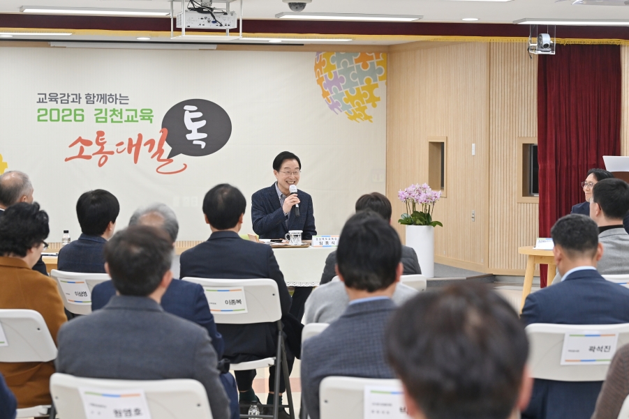 | 경상북도김천교육지원청(교육장 모태화)은 3월 9일 대회의실에서 관내 각급 학교장 대표단, 학교운영위원장협의회장, 학부모회협의회장, 녹색어머니회장, 학부모자원봉사자회장, 주민감사관, 민원제도개선협의회장, 공약이행평가단, 주민참여예산위원, 교육계 원로 등 교육가족 30여 명을 초청하여 ‘2026 교육감과 함께하는 김천교육 소통대길 톡’을 개최하였다.