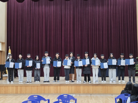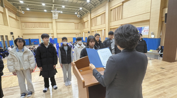 | 지품천중학교(교장 이명자)는 대한불교 조계종 청암사(주지 상덕스님)으로부터 학생 장학금 지원을 받아 2026학년도 입학생 14명 전원에게 장학금을 수여하였다. 이번 장학금은 학업에 성실히 임하고 새로운 학교 생활을 시작하는 학생들에게 격려와 응원의 의미로 전달되었다.