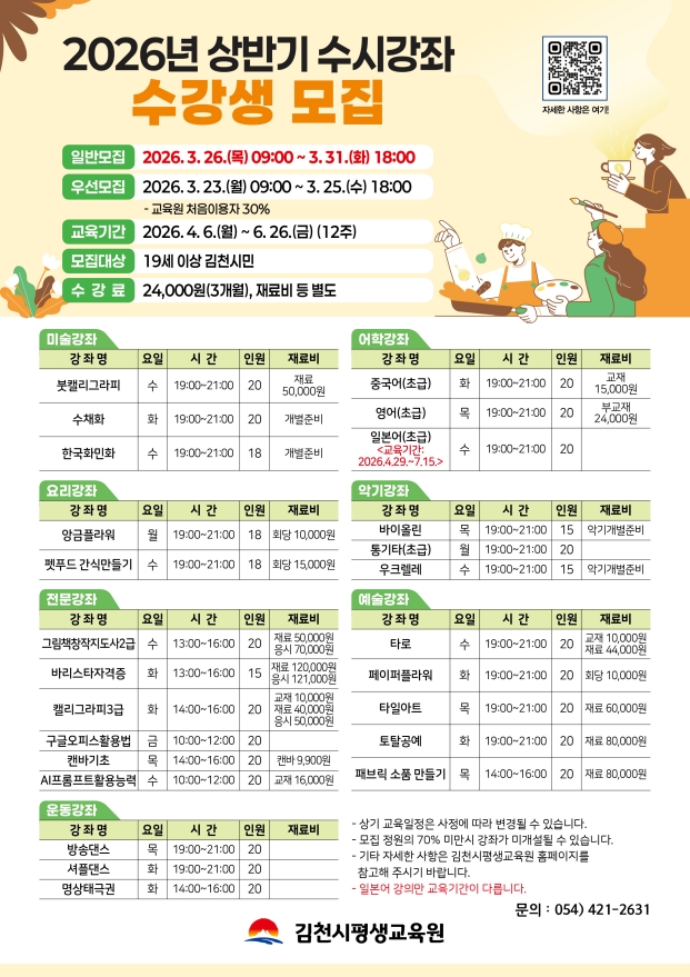 | 김천시평생교육원은 2026년 야간강좌 집중 편성과 수요자 맞춤형 교육 강화를 위해 수시강좌를 대폭 확대하여 오는 3월 23일부터 31일까지 수강생을 모집한다.