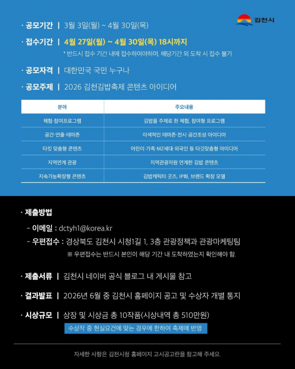 | 김천시는 국민과 함께 만들어가는 참여형 축제를 위해 ‘2026 김천김밥축제 아이디어 공모전’을 개최한다.