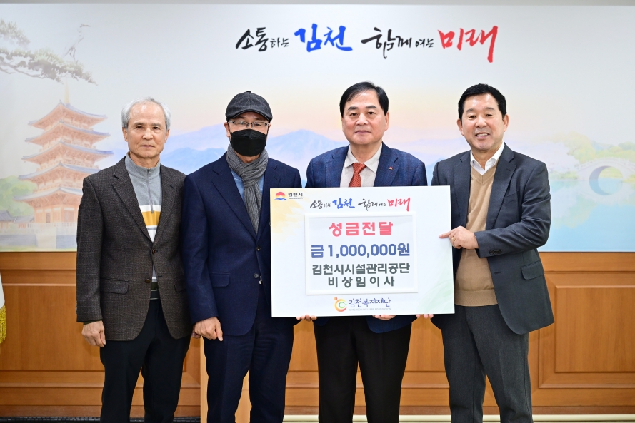 | 김천시(시장 배낙호)는 지난 3월 11일, 김천시시설관리공단(이사장 김재광)의 강국원·김영조·변성철 비상임이사 3인으로부터 성금 100만 원을 전달받았다고 밝혔다.