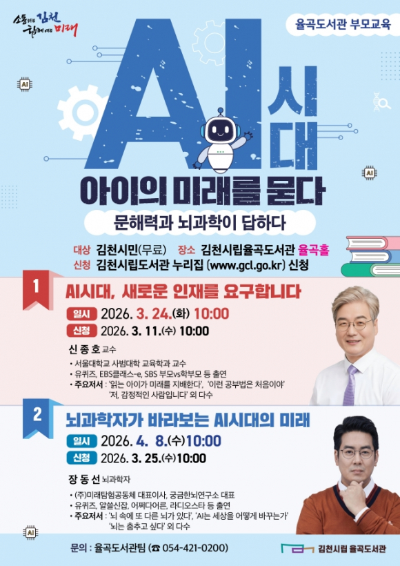 | 김천시립율곡도서관은 오는 3월 24일과 4월 8일 오전 10시, 율곡도서관 율곡홀에서 학부모를 대상으로 한 부모교육 특강 「AI 시대, 아이의 미래를 묻다」를 개최한다.