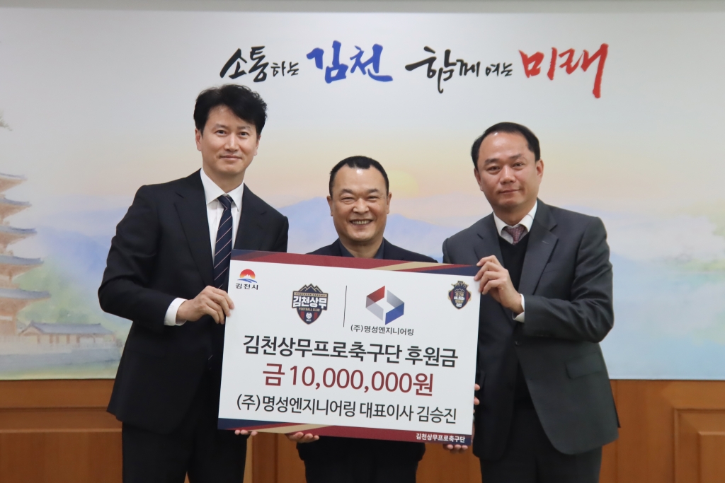 | 김천상무프로축구단(대표이사 이재하)이 3월 13일, 김천시청에서 (주)명성엔지니어링종합건축사사무소의 후원금 전달식을 진행했다. 행사에는 명성엔지니어링 김승진 대표이사, 장재영 상무와 김천상무 이재하 대표이사가 참석했다.