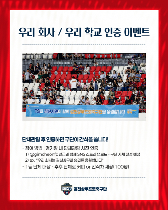 □ ‘퇴근하교, 킥오프’, 직장인&학생 스트레스 날릴 이벤트! 김천상무는 이번 홈경기에 직장인과 학생을 대상으로 ‘퇴근하교, 킥오프’ 이벤트를 준비한다. 올 시즌 첫 야간 평일 경기를 치르는 만큼, 직장인들과 학생들이 경기장을 찾아 스트레스를 풀 수 있는 이벤트가 기다린다.