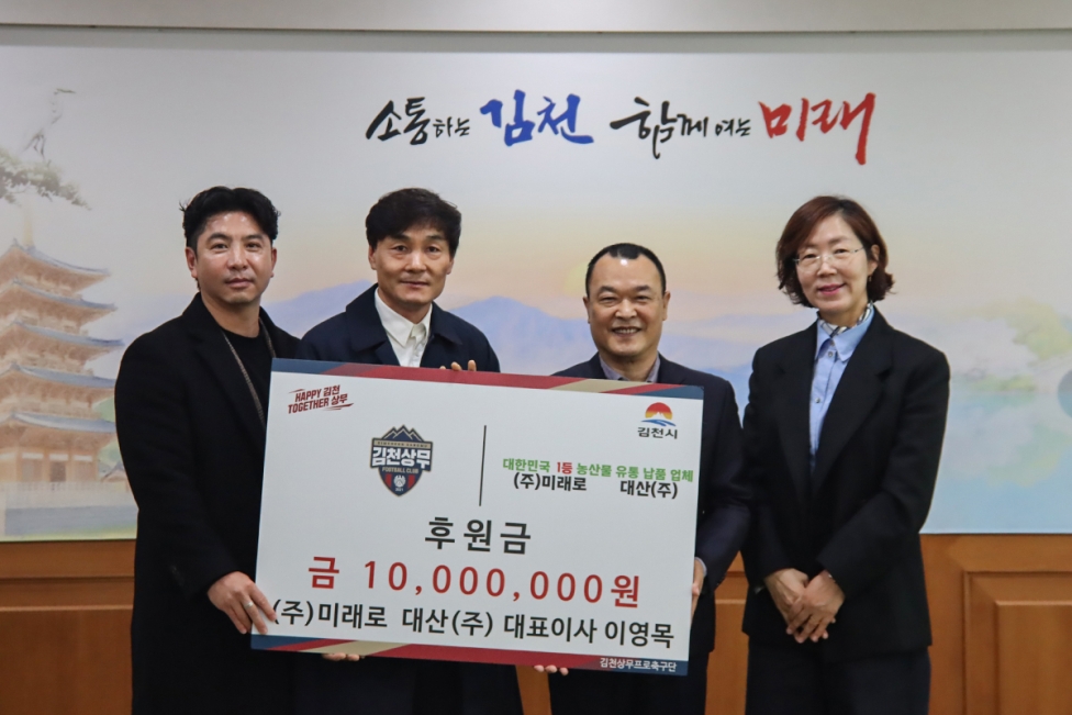 | 김천상무프로축구단(대표이사 이재하)이 3월 16일, 김천시청에서 (주)대산, 미래로(주)의 후원금 전달식을 진행했다. 행사에는 (주)대산, 미래로(주) 이영목 대표와 김천상무 이재하 대표이사가 참석했다.