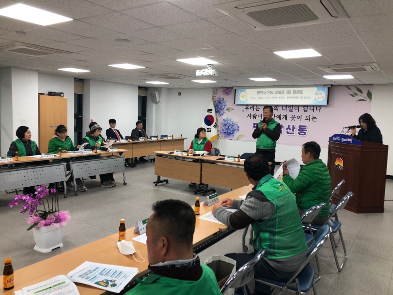 | 평화남산동 새마을협의회(회장 김종호, 부녀회장 박미옥)는 지난 3월 18일 평화남산동 행정복지센터 2층 회의실에서 회원 30여 명이 참석한 가운데 3월 월례회의를 개최했다.