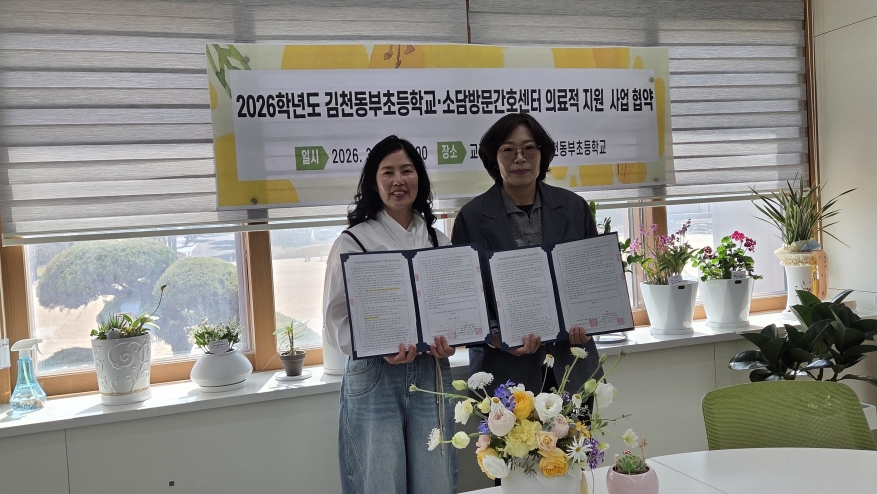 | 김천동부초등학교(교장 권경미)는 3월 26일, 소담방문간호센터와 ‘중도중복장애학생을 위한 의료적 지원 사업’ 용역 계약을 체결하며 2년 연속 중증 장애학생을 위한 안전 교육망 구축에 나섰다.