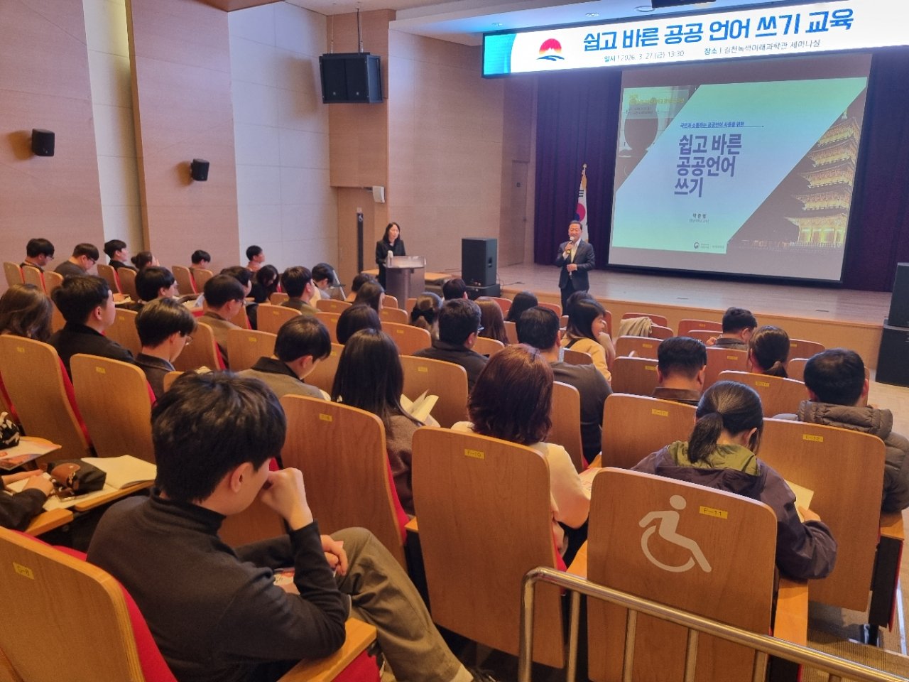 | 김천시는 3월 27일 김천녹색미래과학관 세미나실에서 직원들을 대상으로 ‘쉽고 바른 공공언어 쓰기 교육’을 실시했다.
