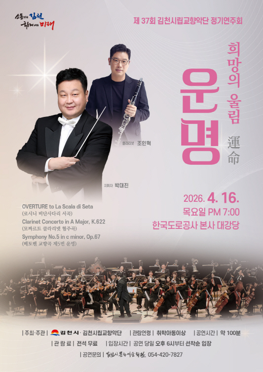 |  | | | ⓒ 김천내일신문 | | 김천시 문화예술회관은 4월 16일 목요일 오후 7시에 한국도로공사 본사 대강당에서 시립교향악단 제37회 정기연주회를 개최한다.