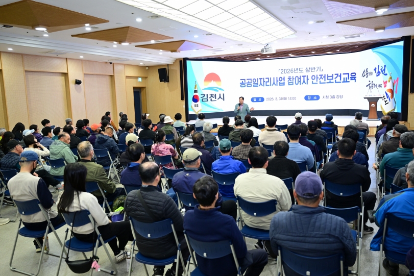 | 김천시는 지난 3월 31일, 시청 3층 강당에서 공공근로, 지역공동체, 희망드림 일자리사업 참여자와 안전관리 담당자 등 110여 명을 대상으로 ‘2026년 상반기 공공일자리사업 참여자 안전보건 교육’을 실시했다.