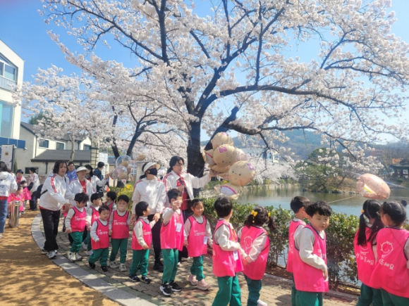이번 캠페인에는 김천시립어린이집 6개소(모암, 개령, 센트럴자이, 율곡, 지례, 아포)의 원생 및 보육교사 120여 명이 참여해 벚꽃 명소인 연화지 산책로를 따라 이동하며 시민들을 대상으로 출산과 육아의 소중함을 전달했다.