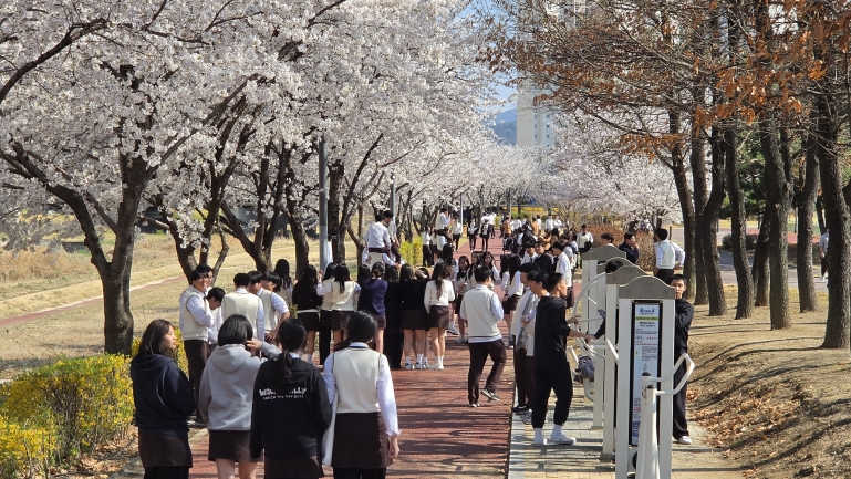 행사에 참여한 1학년 문성호 학생은 “수업만 하던 학교생활에서 잠시 벚꽃길을 걸으며 선생님, 친구들과 이야기할 수 있어 마음이 환기됐다.”며 “학급 단체사진도 남겨서 더 특별한 추억이 됐다.”고 소감을 전했다. 담임교사 이치호 교사는 “짧은 시간이지만 함께 걷고 대화하는 과정에서 학생들의 관계가 한층 부드러워지는 것을 느꼈다.”며 “이런 사제동행 활동이 학교 공동체 문화를 단단하게 만드는 밑거름이 된다.”고 말했다.