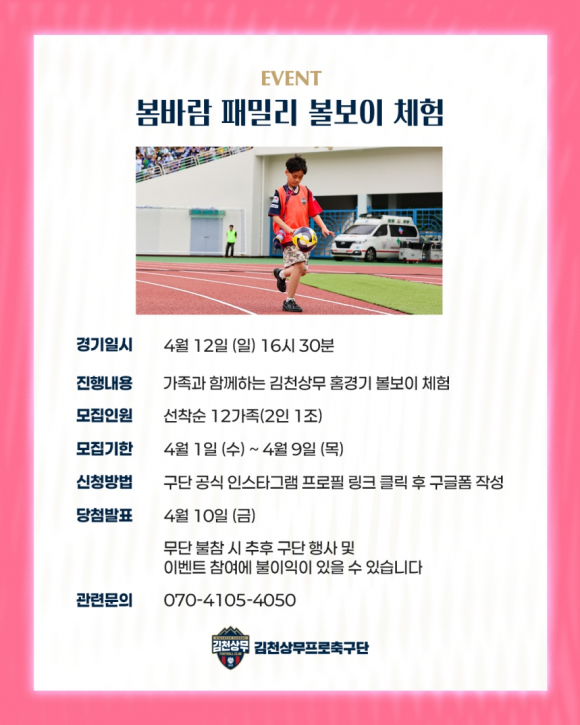 | □ 흩날린 벚꽃의 아쉬움을 채우는 홈경기 이벤트! 김천상무는 오는 홈경기 완연한 봄을 알리는 이벤트로 홈팬을 맞이한다. 먼저 선수들과 함께하는 봄소풍 이벤트가 열린다. 사전 모집된 총 30팀을 대상으로 진행되며, 선수들과 함께하는 포토타임, 피크닉 세트 증정, 레크리에이션을 즐길 수 있다. 신청 마감은 4월 8일까지다. 이어 4월 9일까지 구단 SNS를 통해 신청 시 패밀리 볼보이 체험, 봄 Kick Off 가족 시축, 패밀리 에스코트 등 다양한 이벤트에 참여할 수 있다.