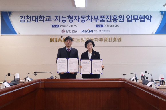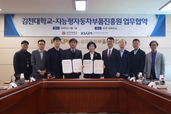 | 김천대학교(총장 윤옥현)는 지난 4월 7일, 지능형자동차부품진흥원과 지역 모빌리티 산업 경쟁력 강화 및 인재양성을 위한 상호협력 업무협약(MOU)을 체결했다.