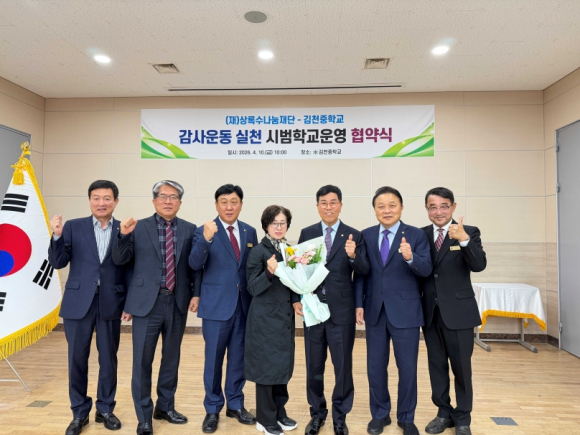 | 김천중학교(교장 장영규)와 상록수나눔재단(이사장 이상춘)은 4월 10일 김천고등학교 B1 대강의실에서 ‘감사운동 실천 시범학교’ 운영을 위한 업무협약(MOU)을 체결했다. 이번 협약은 학생들의 바른 인성과 공동체 의식을 함양하고, 감사와 나눔의 학교문화를 확산하기 위해 마련되었다.