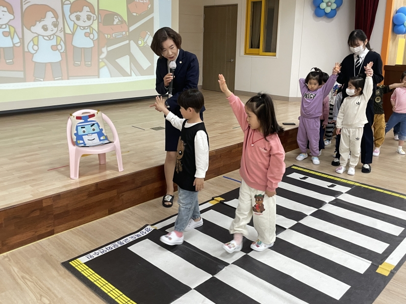 유아들은 유아 발달과 흥미에 적합한 시청각 자료를 통해 차도, 보도와 신호등의 의미, 통학버스 이용 방법 등을 배우고, 횡단보도 건너기 체험 활동을 통해 안전한 도로 횡단법을 몸으로 익힐 수 있는 시간을 가졌다.