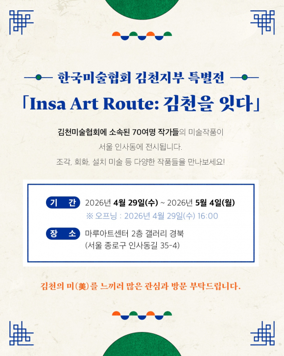 | 김천시는 4월 29일부터 5월 4일까지 6일간 서울 마루아트센터 2층 갤러리 경북에서 한국미술협회 김천지부 특별전 ‘인사 아트 루트(Insa Art Route): 김천을 잇다’를 개최한다고 밝혔다.