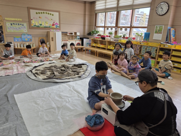 아이들은 조물조물 흙을 만지며 촉감과 색깔, 성질을 직접 탐색하는 시간을 가졌다. 손으로 느끼는 부드러움과 거칠음, 흙의 다양한 변화 과정을 경험하며 오감을 자극 받았다. 또 흙을 밟아보며 형태를 만들고, 형님과 동생이 함께 다양한 구조물을 구성하는 활동도 진행되었다. 아이들은 자유로운 상상력을 바탕으로 형태를 빚으며 표현력과 집중력을 보여주었다. 더불어 물레빚기 체험을 통해 흙이 회전하며 형태가 만들어지는 과정을 관찰하고, 직접 작품을 완성해보는 특별한 경험도 해보았다.