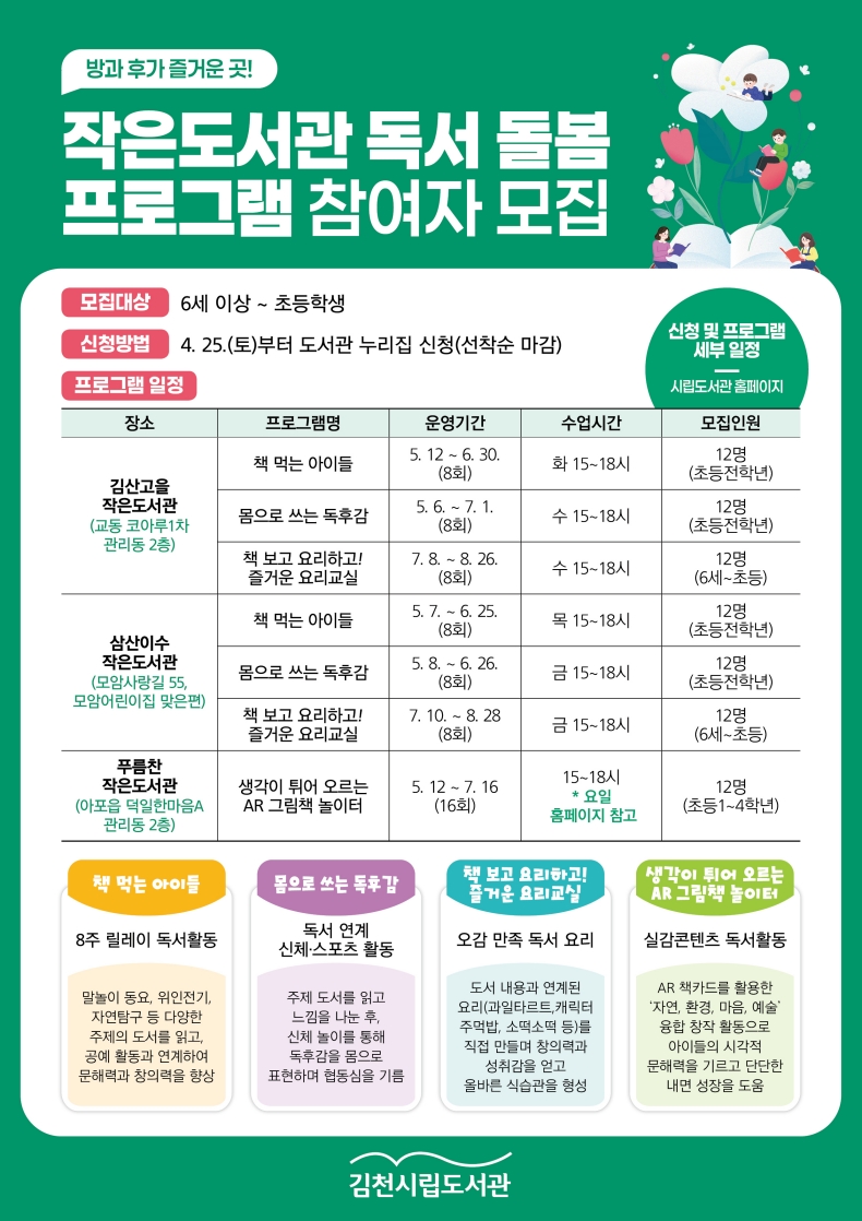 주요 프로그램으로는 다양한 주제의 책을 읽고 공예 활동을 하며 창의력을 키우는 <책 먹는 아이들>, 북 컬링·솔로 탁구 등 신체 놀이를 통해 독후감을 몸으로 표현하는 <몸으로 쓰는 독후감상문>, 도서 내용과 연계된 요리를 직접 만들며 올바른 식습관을 형성하는 <즐거운 요리교실> 등이 준비되어 있다.