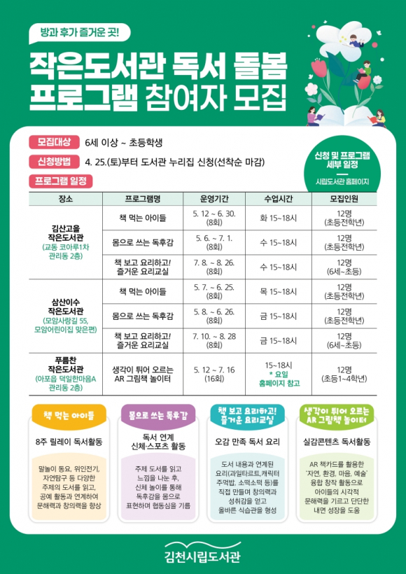 | 김천시립도서관(관장 이신기)에서는 지역 내 아이들에게 안전하고 유익한 돌봄 환경을 제공하기 위해 오는 5월부터 8월까지 ‘2026년 함께 키우는 작은도서관 돌봄사업’을 추진한다고 밝혔다.